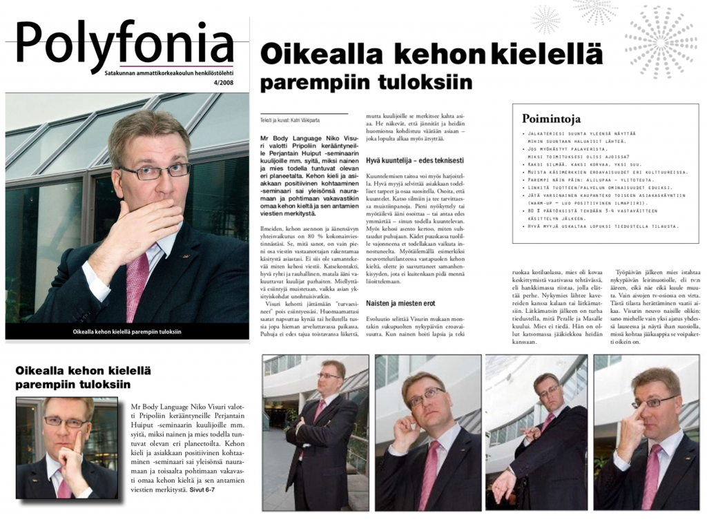 Mr. Body Language® – Niko Visurin vauhdikas ja hauska kehonkieli Valmennus / Show saa kuulijat nauramaan. Se avaa kuulijoiden silmät katsomaan uudella tavalla ympäristöä ja kanssaihmisiä ja auttaa havaitsemaan ja hyödyntämään kehon kielen viestintää omassa toiminnassa niin työssä kuin vapaa-aikanakin, sekä lähikontakteissa, että nyt etäyhteyksissä, joissa viestinnän haasteet erityisesti korostuvat.
